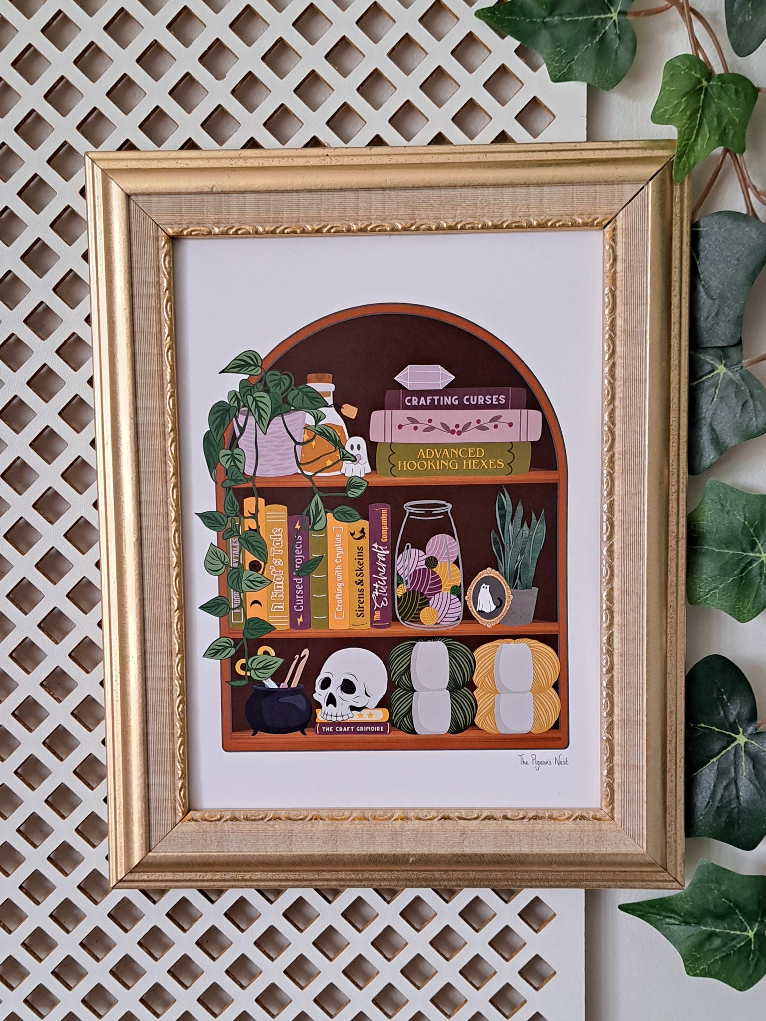 This Spooky Craft Bookcase A5 art print is the glow-up your space deserves. It’s got everything a yarn witch needs: spellbooks, potions, skulls, and—obviously—yarn stacked high like the true altar it is. Yes, those book titles are cheeky (Crafting with Cryptids is a personal fave), and yes, it will absolutely call out your fiber-obsessed soul every time you look at it.